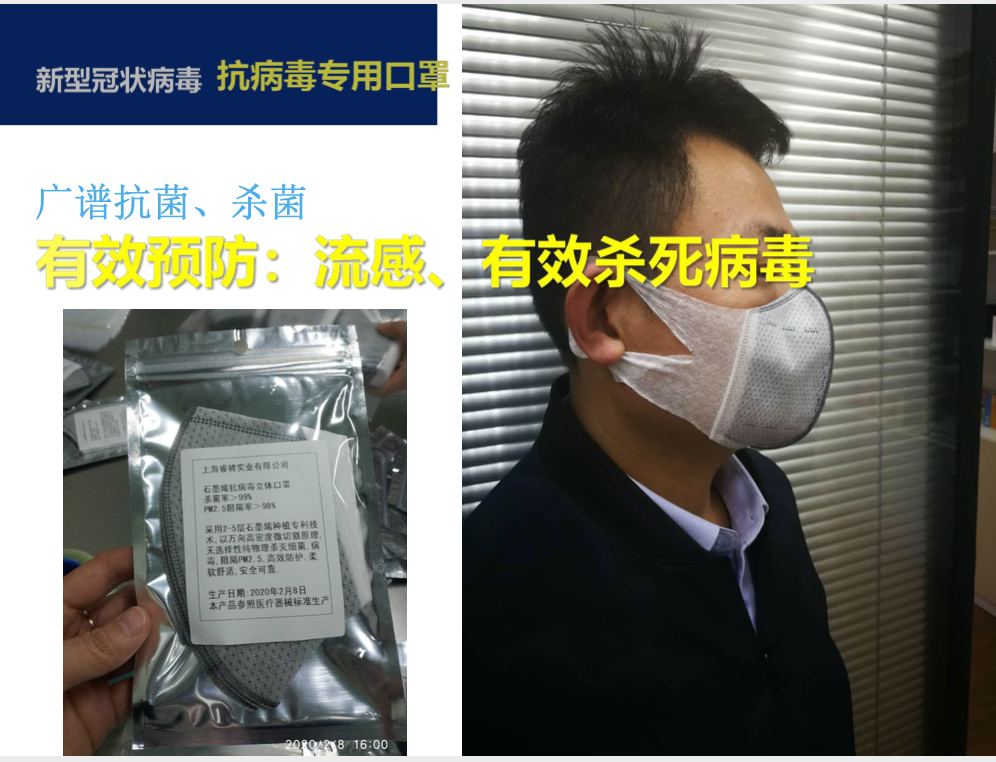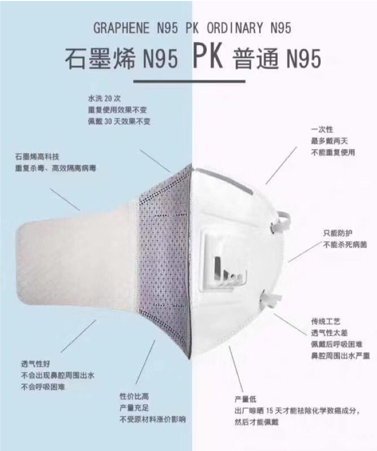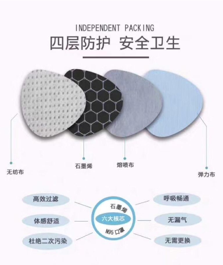 The only effective virus-killing Graphene high-tech anti-virus masks which has the function of protection, anti-bacteria, sterilization, self-cleaning and environmentally friendly. The antibacterial activity of graphene-modified fabric was 99% after 20 times washing